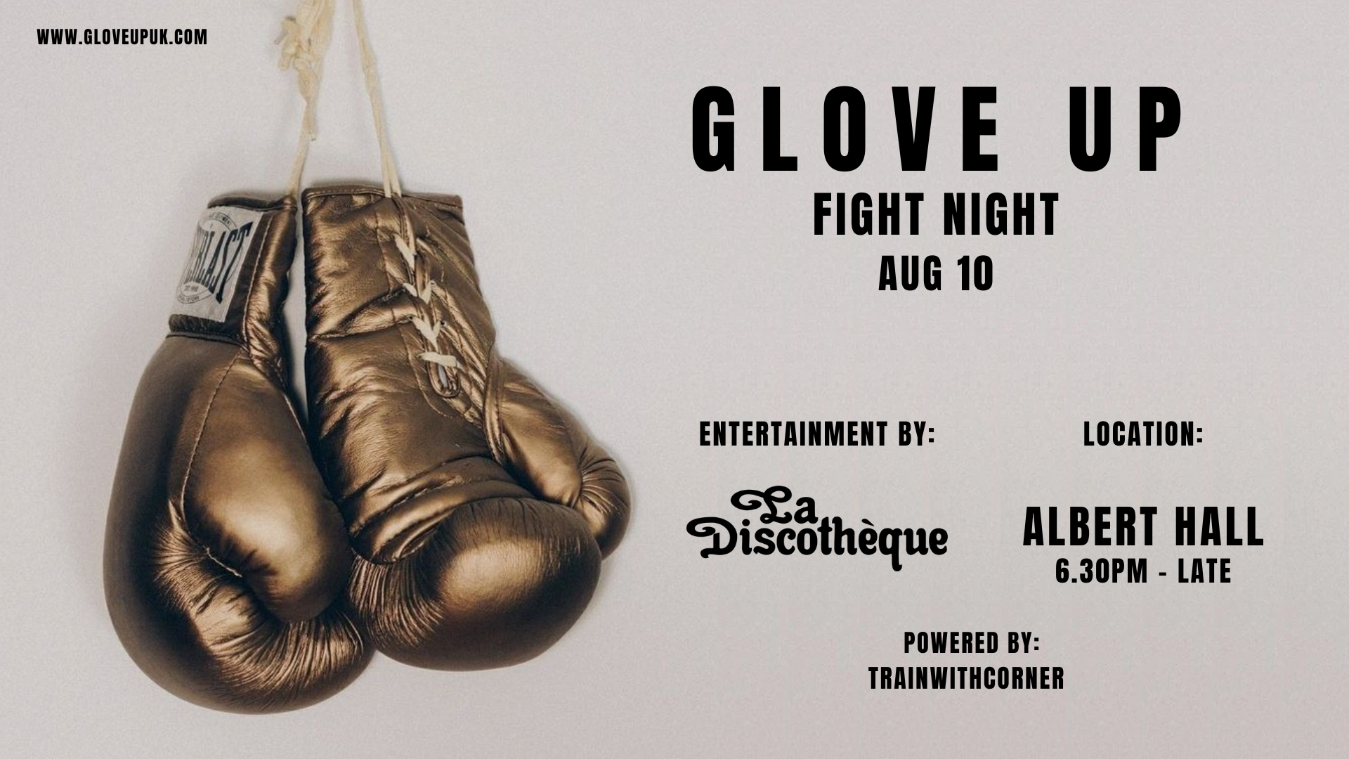 Join us on Saturday the 10th of August for Glove UP‘s Fight Night boxing event raising funds for Royal Manchester Children’s Hospital! Powered by Corner, with entertainment by La Discothèque.