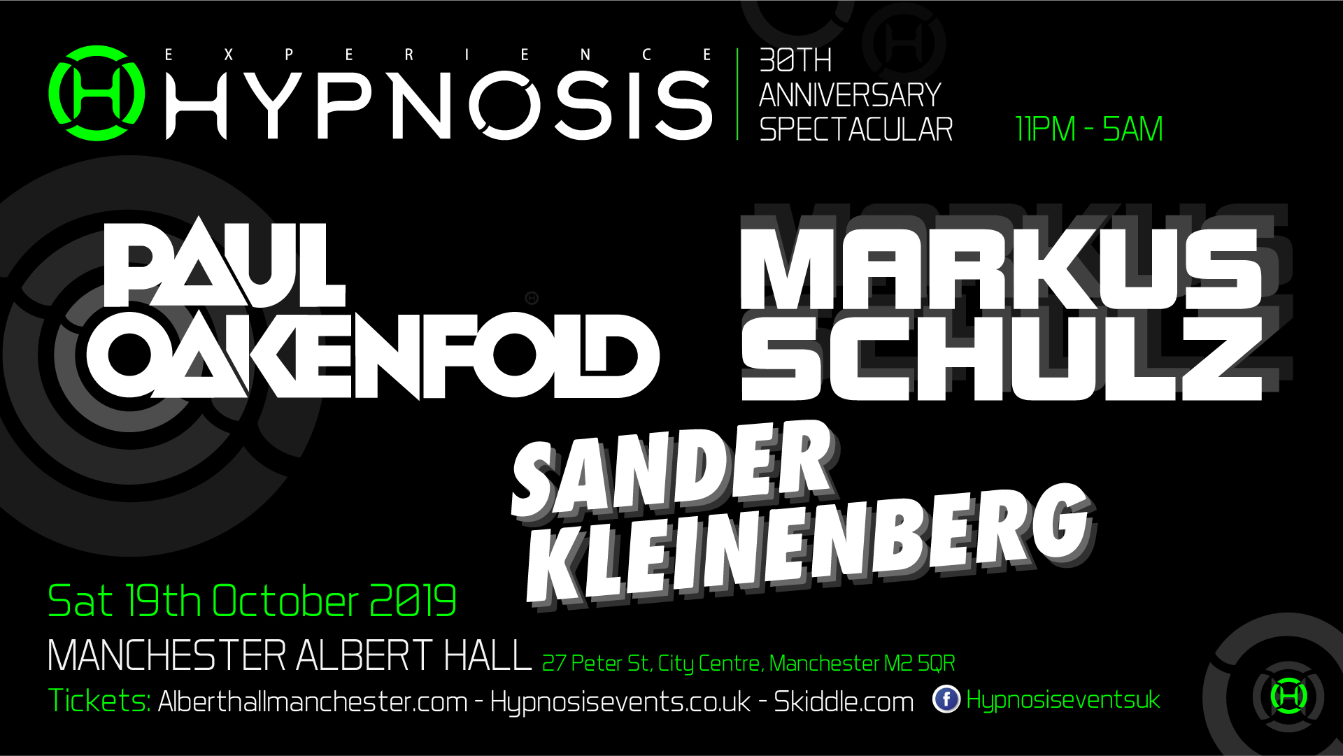 Due to unforeseen circumstances we regret to inform you that the Hypnosis event on 19th October at Albert Hall w/ Paul Oakenfold, Sander Kleinenberg + Markus Schulz has been postponed. We apologise for any inconvenience this may have caused. We will be announcing a new Hypnosis date soon, but in the mean-time you’re able to request a refund direct with the ticket agent you purchased tickets with.