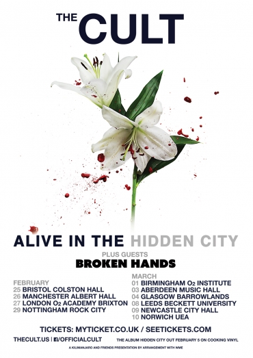When The Cult were preparing to hit the stage at Coachellain 2014, few were expecting the fury that the band delivered. As the festival goers milled about, packing in the field in front of the stage, Ian Astbury and Billy Duffy were building up to a crescendo, of which, when the smoke cleared,Rolling Stonewould hail as “the Messianic moment of Coachella”. Critics have hailed the band as incendiary, ground-breaking, and transcendent, but the band themselves choose to look forward… and in a lot of ways, prefer to be seen as survivors… marginalized and vulgarized, much in the same way their song subjects have been. And it was on the ride home from this performance in the desert that the roots of their tenth albumHidden Citybegan to take root. And it was then that the Astbury realized he was ready to begin putting together the final chapter of a trilogy – one that hadn’t been not, until then, fully realized… one that, with the release ofHidden Cityin early 2016 would complete a circle that had been forming a long time before… one that, when complete, would encompass their acknowledgement of the global community within a metaphor for our spiritual lives, our intimate interior lives… one that spoke for those with voices who are not heard… those who live in outside of the public eye, within the “Hidden City.”